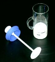 ミルクホイッパーは、シリンダー部と蓋付きフィルターで構成されています。 シリンダー部のミルクに対しフィルターを上下させることで、ミルクに空気を含ませて泡立てます。
