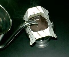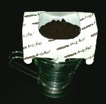 続いて、ペーパーの上からコーヒーの粉を入れます。 一度にはいる量が少ないので、コーヒー粉は細引きのものを使用するか、ちょっと多めに加減します。